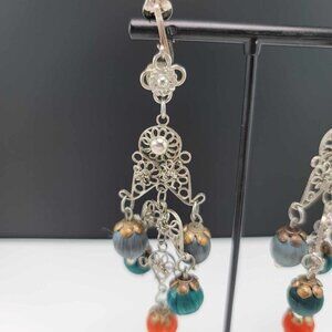 Beautiful silver tone clip-on filagree dangle earrings with multi coloured fabric ornaments.