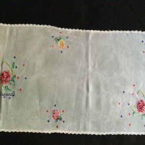 It is a beautiful table runner cross stitch handcrafted with a floral rose design signed.
