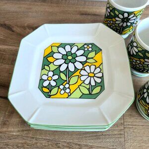 Beautiful vintage 1970s green and yellow set of 4 footed cups and 4 octangular plates with floral daisy design. Japan Flower Power.