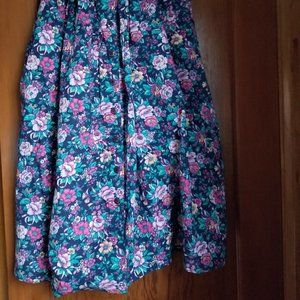 Colours: navy blue background with pinks and yellow roses and flowers and green leaves, pink ribbons. Material light weight 100% cotton, condition little used, hardly worn, well cared for. Creasing from storage. Washing info. machine wash, machine dry. Boho vibes, cottagecore, farmhouse, garden.
