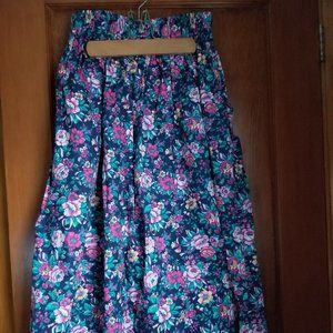 Vintage 80s, long, cotton, colourful, floral and leaf design, flowered, full skirt with gathered waist, front centre buttons and 2 front side pockets, long, below mid-calf. Made by Lady Footlocker. Versatile, office wear, casual wear.