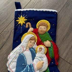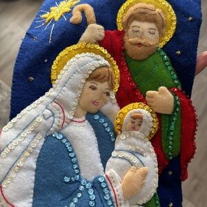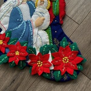 Beautiful vintage finished Bucilla Christmas stocking “the holy family”.