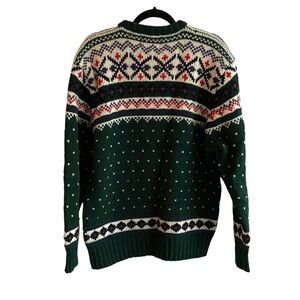 Beaver CANOE Hand Frame Knit Shetland Wool Crew Neck Sweater Green Cream L