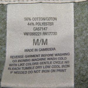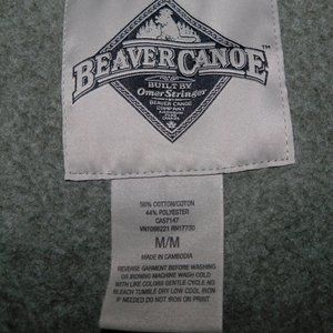 This Womens Medium Beaver Canoe Khaki Green Military Utility Style Cotton Polyester Blend Full Zip Jacket is in great clean condition ** NOTE there was an internal draw string around the waist which has been removed. Jacket is 50% Cotton - 50% Polyester - Machine washable. Features 4 Front button closure pockets and Beaver Canoe logo patch on one upper arm.