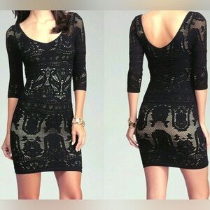 Bebe Black Tan Bodycon above the knee Dress Scoop Neck 3/4 Sleeves size Small