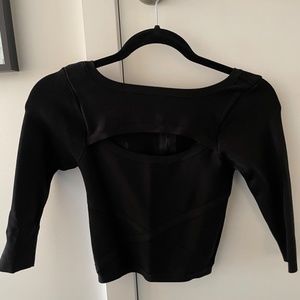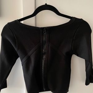 Thick material. Good for warm weather. Cropped. Stretchy. Opening in the front and zipper in the back.