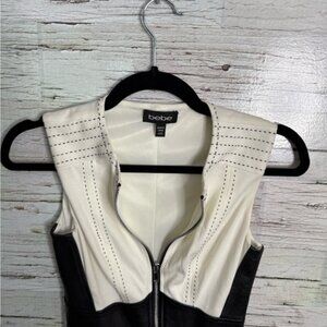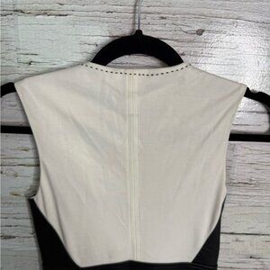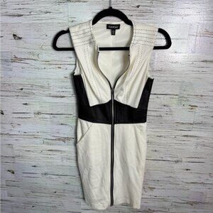 Elegant sleeveless dress with a bold front zipper. Features contrasting black and white panels.