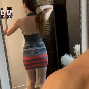 This Bebe halter dress features a soft grey bodice paired with a fun coral skirt detail for a bright, summery pop. Lightweight and flattering — perfect for warm weather, beach getaways, or a tropical vacation.