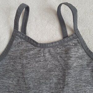 - Two Bebe girls' camisoles: One gray and one light baby pink. Both feature a slight V-neck, spaghetti straps, "Bebe" written across the collar, and gems. Made of a nylon, polyester, and spandex blend. Good used condition with slight fading from washing (gray) and some slight pilling (pink).