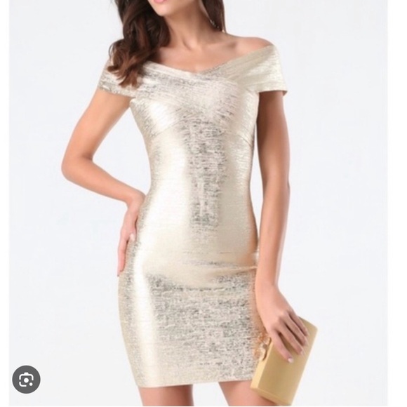 Bebe Gold Ruched Off-Shoulder Bodycon Dress