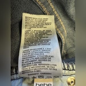 Dark wash denim jeans good stretch available 5 pocket design belt loops button and zipper closure straight leg Bebe decal across bum