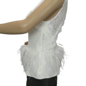 This stunning top marries intricate detailing with contemporary design elements, making it a standout in any wardrobe. Woven from delicate lace, this top features a high collar that frames the neckline beautifully. The keyhole front detail offers a hint of allure, creating a focal point that draws the eye. Feathers delicately adorn the waistline, providing a whimsical and ethereal touch that contrasts elegantly with the lace. The back of the shirt is designed with sheer fabric, both on the upper front and throughout the back. This sheer detailing not only adds a hint of sensuality but also showcases the intricate lace pattern and allows for a glimpse of skin, creating a captivating look from every angle. Perfect for special occasions or evenings out. Pair it with tailored trousers or a sleek skirt to complete a striking ensemble that exudes confidence and style.