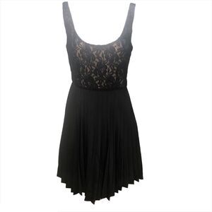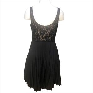Very good pre owned condition. Top is floral lace covered overlay. Bottom is pleated skirt. Side zipper. Approximate measurements when laying flat:
