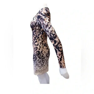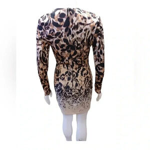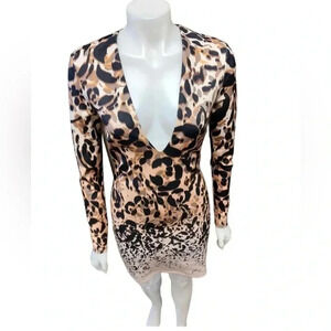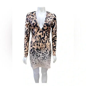 Bebe Leopard Print Long Sleeve Deep V Neck Bodycon Mini Dress Size Small