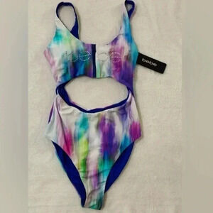 Bebe One Piece Swim Monokini Bathing Suit Zip Rhinestones Crystals Tie Dye S