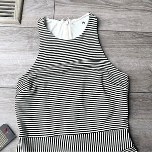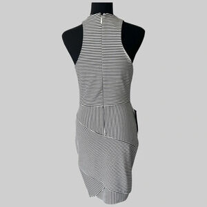 Cute and fun! Short, stretchy, sleeveless mini dress Features black and white stripes sewn in an asymmetrical pattern, and an asymmetrical hem.