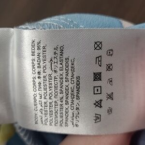 In good used condition, no flaws seen. Lovely multicolour shorts with an asymmetrical overlap front panel to give the image of it being a wrap skirt. High waisted short with zipper in back. 96% polyester, 4% spandex.