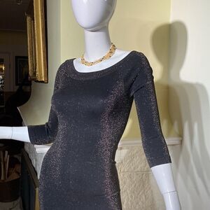Wow! What a fabulous little party dress! Black with gold threads that make it shimmer and glow, super stretch fabric hugs and contours your figure ensuring a sexy and flattering look. 3/4 length sleeves, boat neck, thigh length.