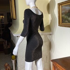 Bebe Stretch Metallic Black & Gold Bodycon Mini Dress 3/4 Sleeves
