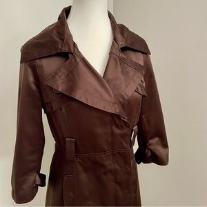 Bebe Vintage Y2K Brown Satin Trench Coat Double Breasted Size Extra Small. Exaggerated lapels. Hidden buttons. Front pockets. Gorgeous chocolate brown satin material. Knee length. From early 2000's. Size extra small. Excellent condition, just missing the belt unfortunately.