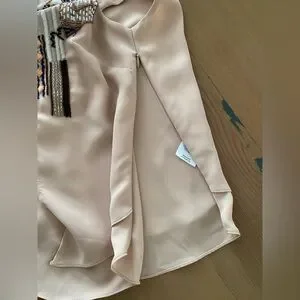 Size XS. 💯 polyester. Blush peach coloured. Deep neckline. Layered. Side zip. Loose fit. Gently worn — no damage. P2P 16.75” Waist 18.5” Length back 22”