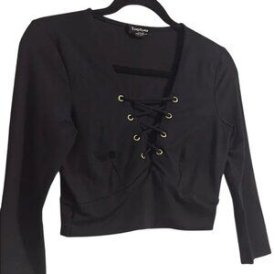 Bebe Black Tie Front 3/4 Sleeve Crop Blouse is a midriff-exposing crop top with 3/4 length sleeves. It features a V-neckline with a lace-up or tie-front detail, where a cord is threaded through multiple metal eyelets. This design allows for adjustable tightness and a customizable fit at the neckline