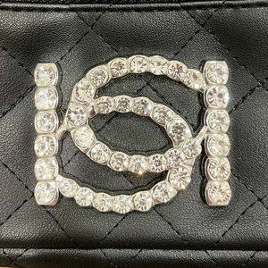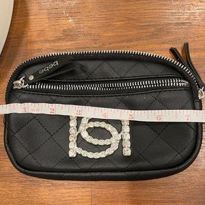 Bebe quilted logo faux rhinestone pouch in black with silver details. It used to come with a belt to wear as a belt bag/fanny pack but I don't have the belt anymore. It can be used by itself as a pouch or wear with any black belt, selling as is. Top zipper closure with zip pockets on the inside and outside. In excellent slightly used condition. The only noticeable detail is the Bebe logo in one of the zipper pulls is slightly rubbed off (shown in pictures).