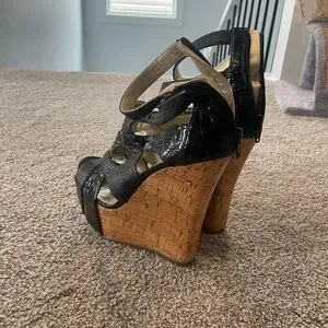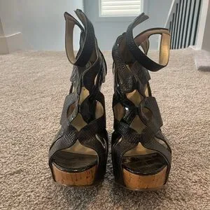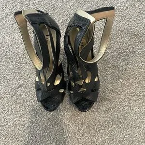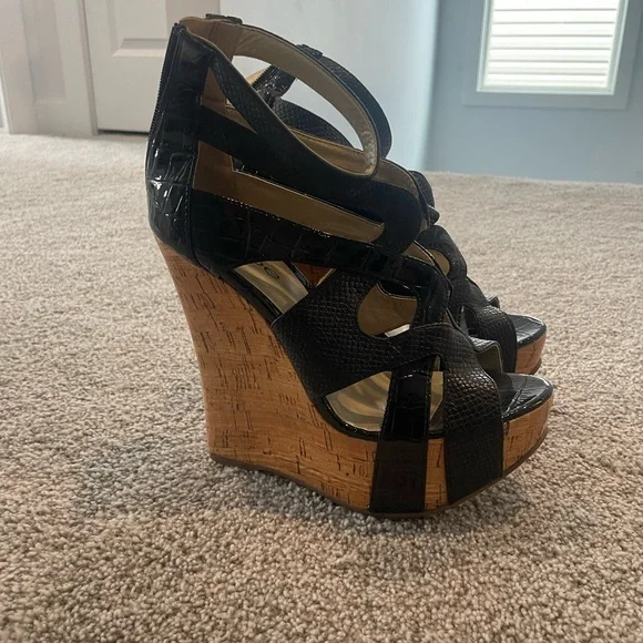 Beautiful wedges worn one time. Beautiful thin strap detail and zip up in the back. They still look brand new.