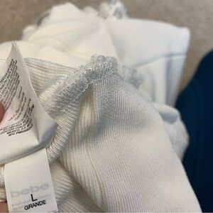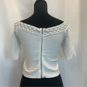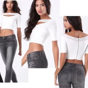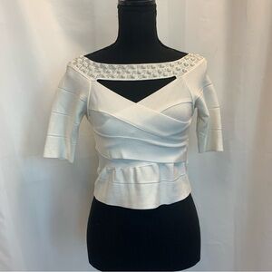 Bebe white bandage rhinestone jewelled cutout crop top Sz L
