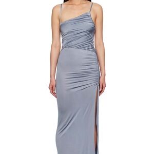 The Bec & Bridge dress is a stunning choice for prom or cocktail events, featuring an asymmetrical one-shoulder design with a spaghetti strap. Its ruched detailing and side slit add a touch of elegance to the bodycon silhouette, while the blue-gray color exudes sophistication. Crafted with a sleek, minimalist style, this dress is perfect for making a statement at any formal occasion.