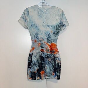 This Bec & Bridge mini dress is perfect for a night out, featuring a striking blue and white color palette. The bodycon style with a crew neck and short sleeves offers a chic and modern look. Its artistic design adds a touch of elegance to any casual occasion.