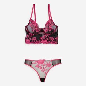 Bed of Roses Black Pink Floral Bra Thong Set S.