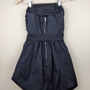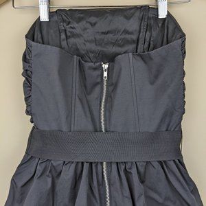 Features, bubbled skirt attached to a ruffles strapless top, 2 hooks on the side for a belt and a fabric belt.