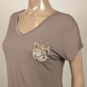 Bedo Femme Sequin Pocket Top Vneck Short Sleeve Dolman Tshirt Brown Gold Modal