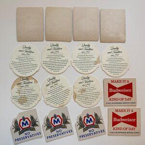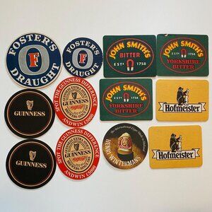Lot of 36 vintage beer and liquor coasters featuring a mix of domestic and international brands. This collection includes well-known names such as Molson, Guinness, Budweiser, Fosters, Captain Morgan, and Hofmeister, among others. A great assortment for decorating a home bar, kitchen, or man cave—or for collectors who appreciate advertising and brewery memorabilia.