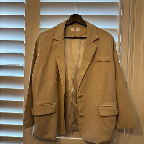 Stylish beige blazer jacket with a classic design. Perfect for formal or casual wear.
