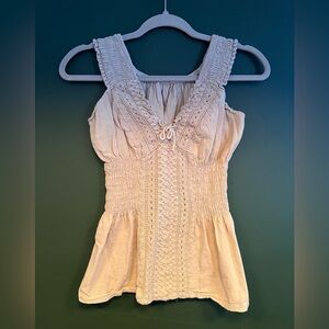 Small to medium sized cream sleeveless top with crochet detailing. Perfect for casual outings. #boho #organic #fairycore