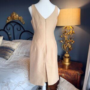 Beige dress from BCBG Max Azria Collection, size 6. Boatneck, sleeveless, v neck back with zipper. 84% cotton 16% linen, lined with 100% acetate. In excellent almost new condition. Bust measures 17.25 inches laying flat, waist measures 14.5 inches laying flat, hips measure 19.5 inches laying flat, length from shoulder to hem is 39.5 inches. Cat friendly, nonsmoking home.