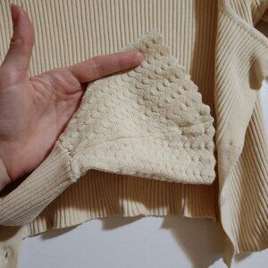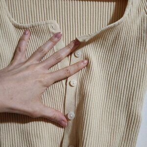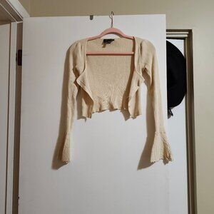 Ribbed, scoop neck, bell sleeves crochet look. Button up. Cropped.