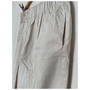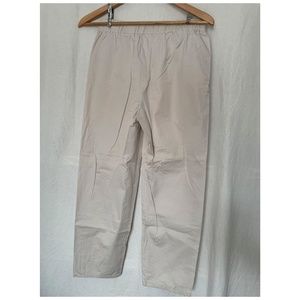 There is no tag, but these are the perfect summer pants and high quality. Very lightweight and crisp fabric in a Cream colour, with an elastic waistband. I am 5'4 petite, and they are ankle length and fitted at the hips.