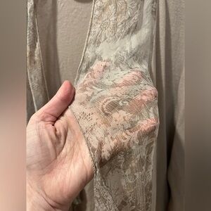 Soft and elegant beige cardigan by Lungo L’Arno, featuring long sleeves and a flowy draped collar in sheer floral fabric. Light and easy to layer, this Italian-made piece brings comfort with a refined touch.