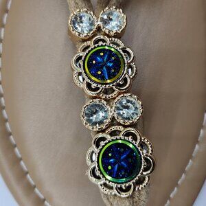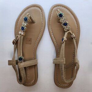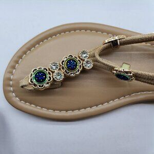Shein Beige Fashion Sandals with Rhinestone Embellishment. NWOT. Beige sandals with blue and clear rhinestone decor. Thong Flat Sandals. Size unknown but length of a size 8 US. Excellent unused condition. Boho.
