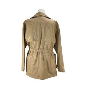 Design: Double-breasted faux leather jacket with snap closures, cinched waist detail, oversized utility pockets, notched lapel, long sleeves