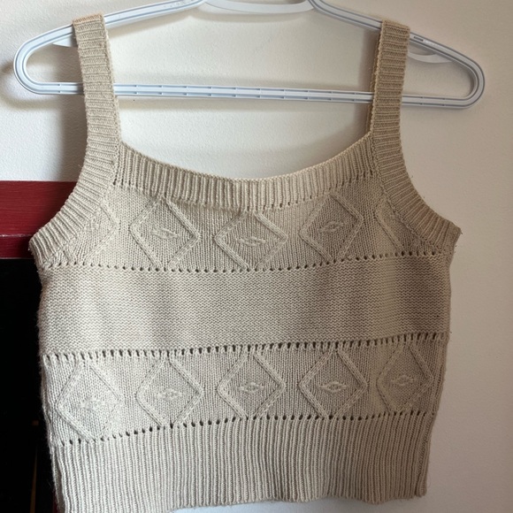 Stylish beige knit tank top with a textured diamond pattern. Perfect for casual wear.