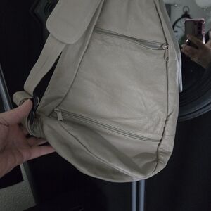 Stylish beige leather backpack with multiple zippered pockets. Perfect for everyday use.
