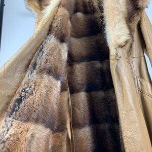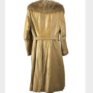 Leather trench coat with real fur collar and lining. Side pockets and removable belt.
