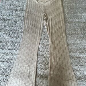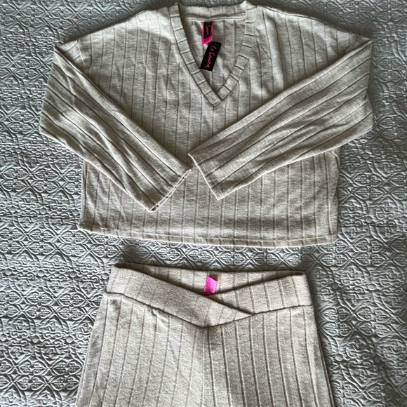 Beige ribbed knit lounge set.