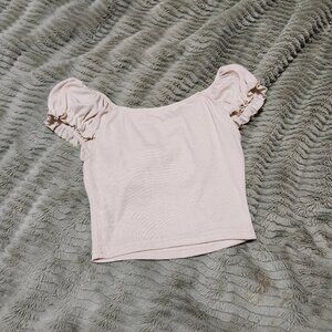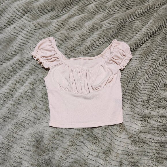 Ribben cream/beige/oat coloured milkmaid top with puffed cap sleeves and a ruched bust. A slightly dressier basic!