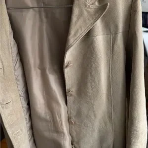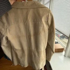 Beige Suede jacket. Classic design with button closure. Ideal for versatile styling. Suede (100% leather). Slight discolouration on back (not noticeable). Works as a slightly over size jacket and has a tie.
