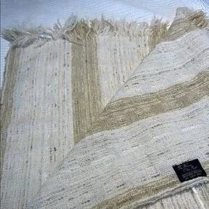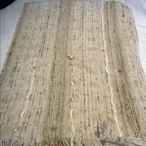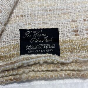 Cozy beige wool wrap with textured design and fringe details. Manufactured in Ireland. Very warm. Could also double as a small lap blanket. Please note that this is a woven piece and that there are some small spaces between pieces of wool.